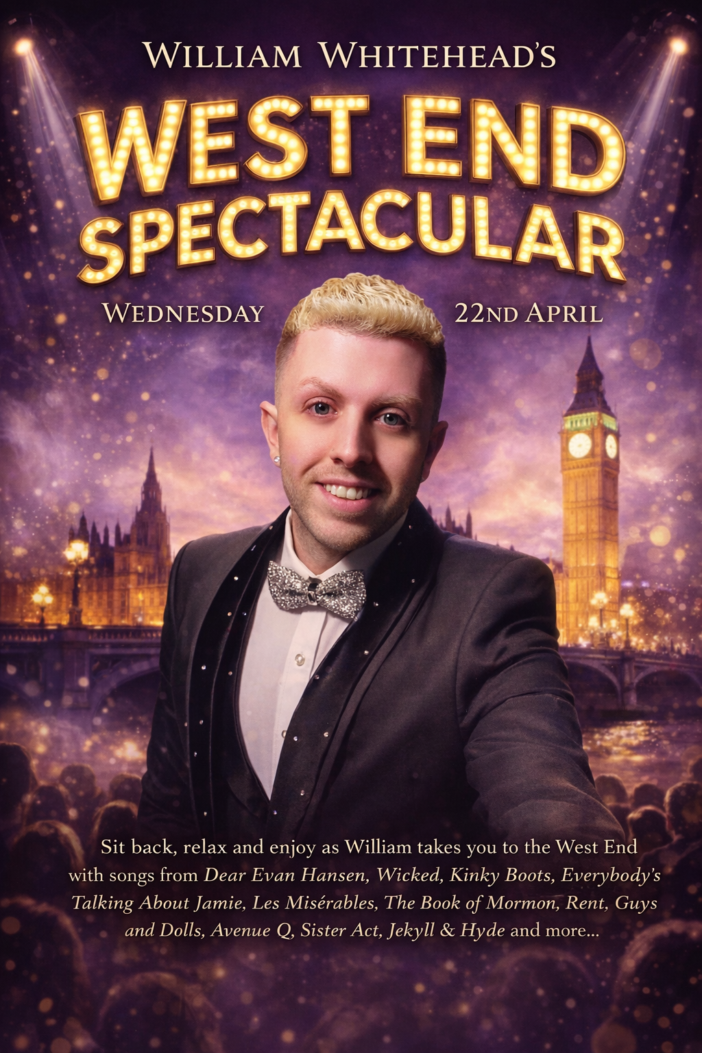 Join us for a fantastic evening of live West End favourites performed by William Whitehead, featuring songs from Dear Evan Hansen, Wicked, Kinky Boots, Everybody’s Talking About Jamie, Les Misérables, The Book of Mormon, Rent, Guys and Dolls, Avenue Q, Sister Act, Jekyll & Hyde and more.✨ Ticket Options ✨